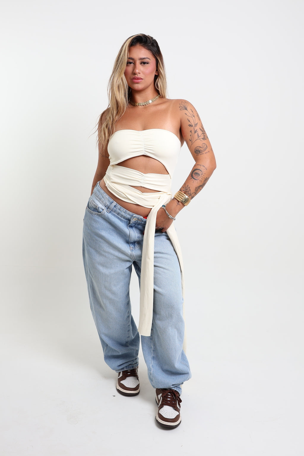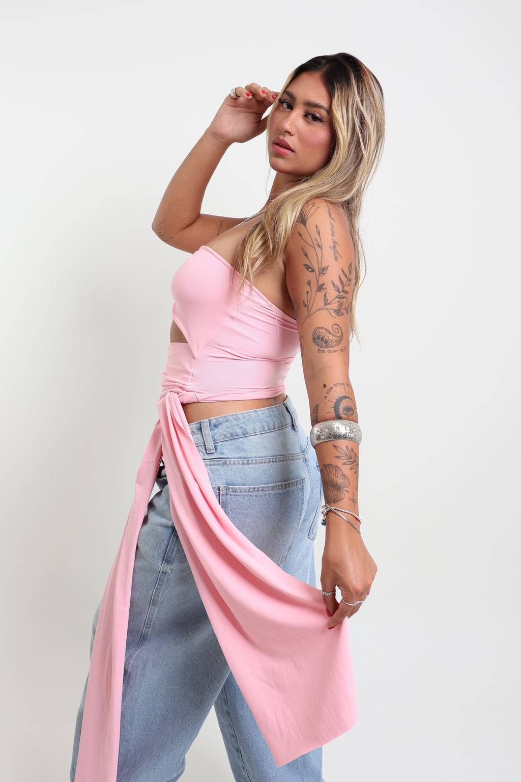 confeccionado em poliamida estilo tecido geladinho, com toque macio e elasticidade em quatro direções. Possui recortes frontais com franzidos em elástico embutido, que valorizam a silhueta e garantem caimento impecável. O detalhe das faixas laterais longas permite amarrações criativas, ajustando-se ao corpo com muito conforto. Além disso, tem elástico interno na parte superior para segurar bem o busto. Tamanho único, veste do 36 ao 42.